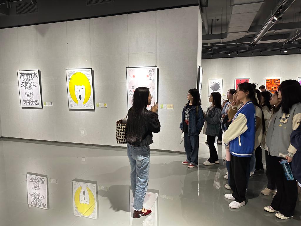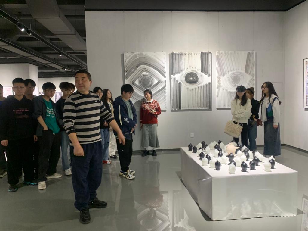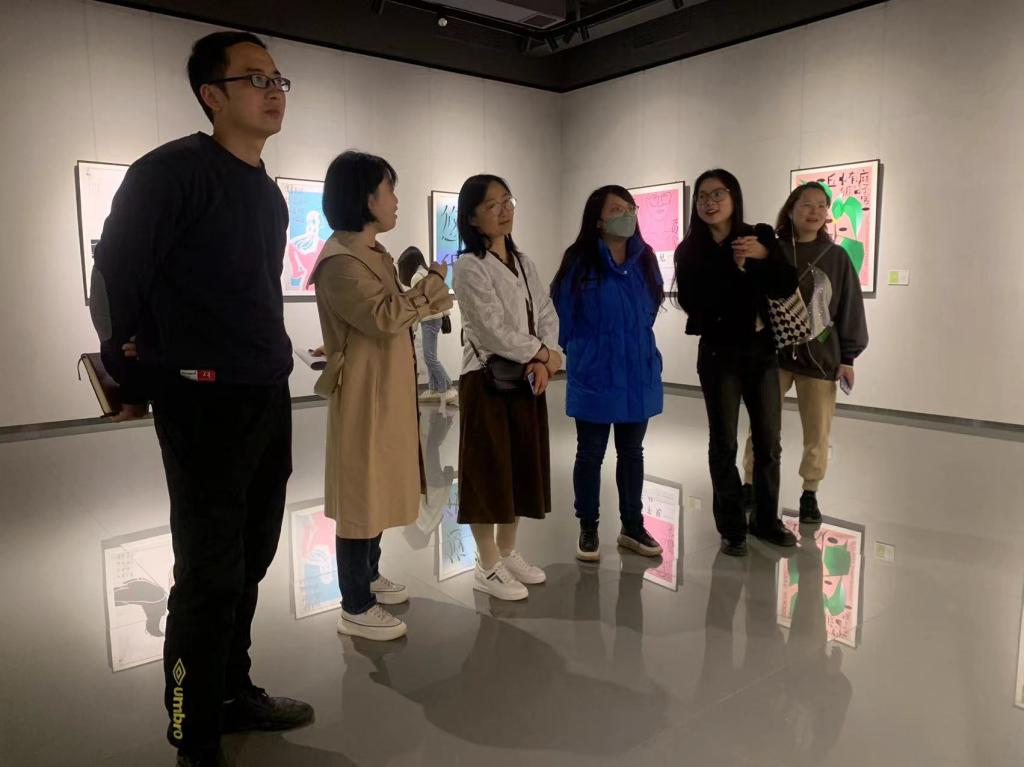 会中,教研室老师集体进入美术馆,在展览现场参观,并交流发言。彭琳老师、王少姝老师提到:将学生领进美术馆,在展览中将课本理论知识结合展览现场分析讲解,学生对知识点的理解和接受度更高。吴涛老师提出,将课堂搬进美术馆,更能激发学生的设计灵感,拓展学生设计视野,提升学生综合素养。
