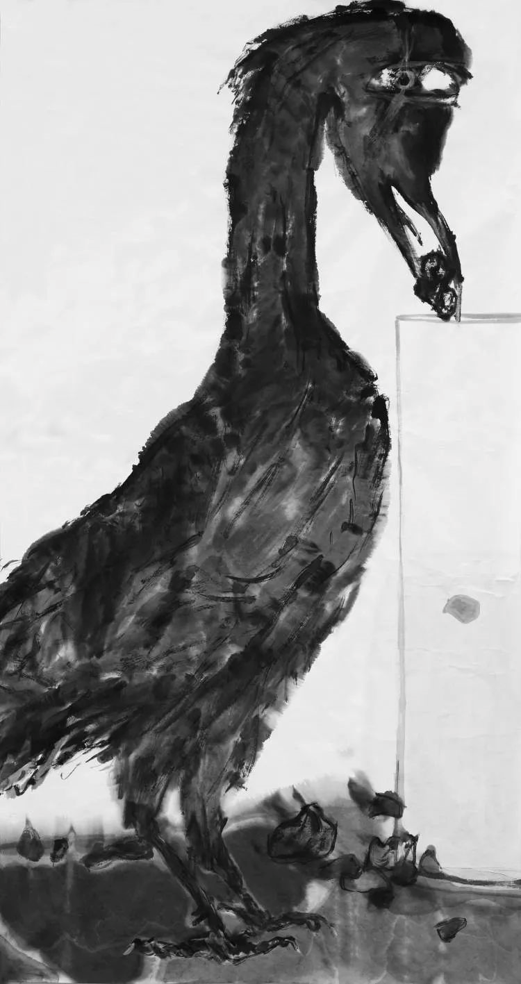《汲水黑鸦1》97×180cm,纸本水墨,2019年