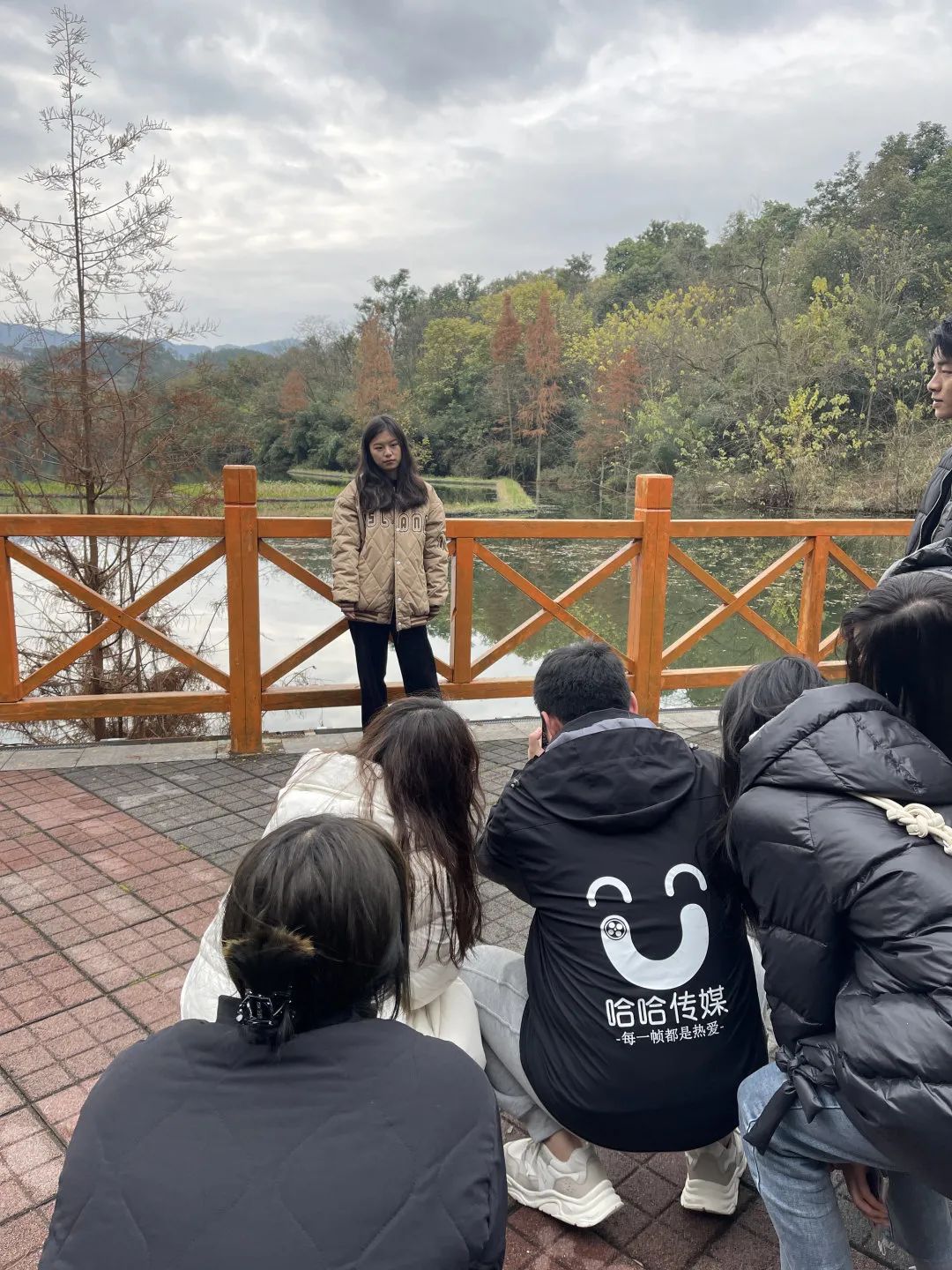 利用草坪、湖、远山以及天空进行构图。同学们挑选一个气质出众的模特,自己尝试拍照,在老师点评指导过后再拍一张,最后进行小结。