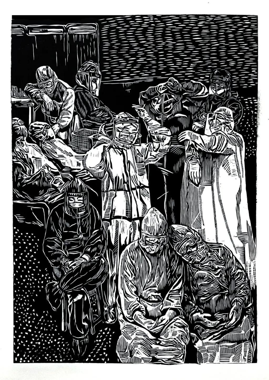 《战疫》 龚蝶 黑白木刻 60x70cm
