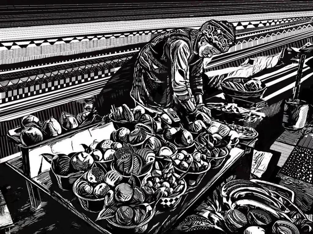 《秉旄》刘慧洁 黑白木刻 80x120cm