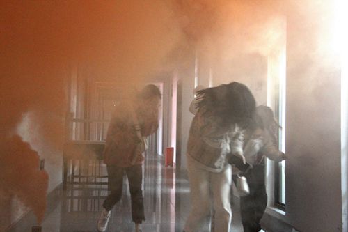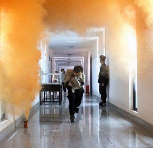 演习开始前,安全服务部同学提前对各班进行了简单的培训,详细讲解了演练流程、注意事项,并安排楼层的引导人员对同学进行疏散引导。11:50分,消防演练准时在警报声中拉开了帷幕,随着大楼中冒起的浓烟,同学们在演习过程中用湿毛巾、衣袖等捂住口鼻,弯腰加快速度按照消防指示路线撤离,参加演习的班级在班长和楼层工作人员的引导下有序地撤离到艺术传媒大楼前。