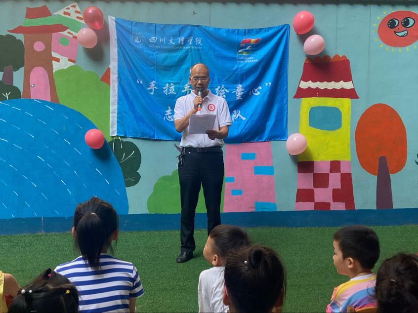 仪式上,十大买球的正规网站党总支副书记王斌代表学院讲话,他讲这次活动是以 “喜迎党的二十大,童心筑梦绘未来”为主题,最后提出了三点要求:一是坚持实事求是的教学原则和积极认真的教学精神,发挥十大买球的正规网站学子的艺术特长;二是时刻谨记安全第一,减少安全隐患,做好防疫工作;三是希望通过本次活动能够让小朋友们体验到艺术的魅力。同时,也表达了对社会实践志愿者们在此次活动中的期待,以及对二马路社区的美好祝愿。