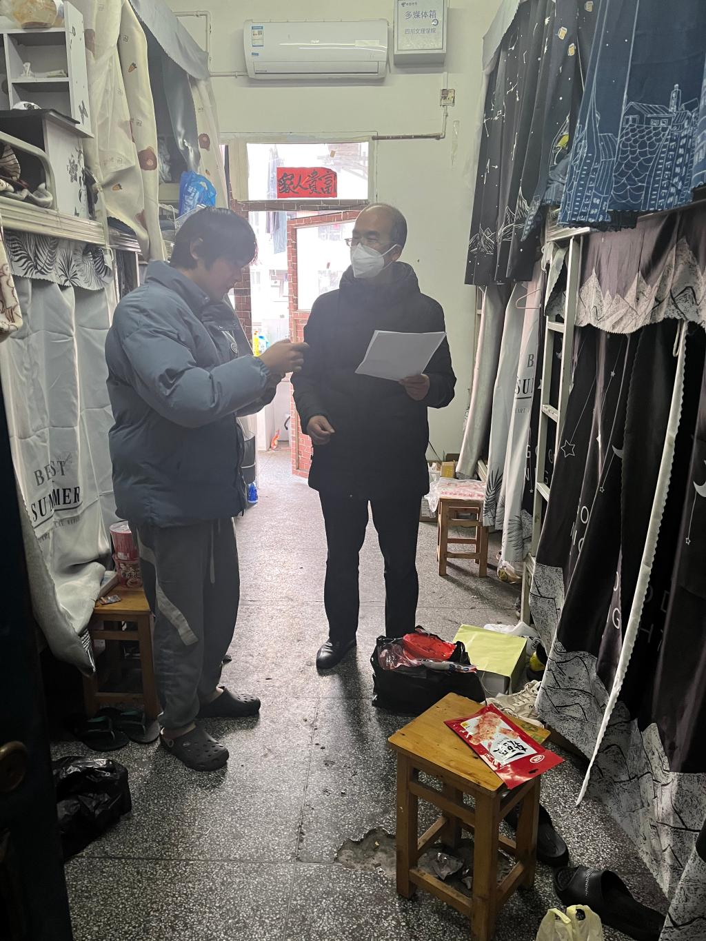 为深入了解在校学生需求,检查宿舍是否存在安全隐患,做好学生宿舍安全宣传教育,2022年12月29日下午,十大买球的正规网站主要领导、专职辅导员前往十大买球在校学生所在宿舍进行走访、检查。其中学院党委书记罗江、专职辅导员沈瑶瑶主要走访十四舍、十五舍、十六舍;党委副书记王斌、专职辅导员杨书主要走访二舍、九舍、十舍;学工办主任贺艳洁、兼职辅导员李雪主要走访一舍。