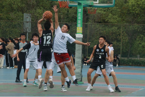 比赛现场热闹非凡,聚集了各院的代表队、篮球爱好者以及热情洋溢的啦啦队。队员们奋斗拼搏、不甘示弱,与对方展开激烈的角逐。随着比赛的推进,队员们开始调整战术,全力打好配合,快攻猛进,多次险中反击,双方奋勇拼搏,互相牵制又互相突破,掌声、尖叫声响彻球场,观众的喝彩点燃了球员们的激情,体育精神在此刻燃到高峰。
