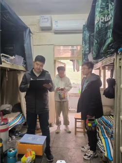 在检查走访过程中,王斌重点围绕学生宿舍整体卫生情况、个人卫生情况和存在的安全隐患进行了排查;贺艳洁重点对卫生死角和使用违规电器进行检查,指出部分寝室需着重改进卫生状况;王兆旺、王誉燃强调同学们要养成良好的生活习惯,预防危险事故的发生,共同维护寝室安全。同时,李雪对学生宿舍生活物品摆放、床上用品的整理以及公共学习室的清洁卫生提出改进意见。