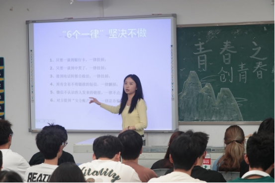 宣讲会上,王斌等向学生们详细介绍了身边常见的电信诈骗,如QQ诈骗、冒充身份诈骗、网络购物诈骗、虚假中奖诈骗、“假车祸或摔伤住院”为名的诈骗、虚构绑架事实的诈骗等,强调“8个凡是”全是骗局、“6个一律”坚决不做、“6个绝不”保驾护航;此外,王斌等人还强调了防范传销、非法集资、严禁租借出售“两卡”等问题,要求同学们不乱扫码、不乱点链接、不随意转账,务必下载国家反诈中心APP并打开预警功能。