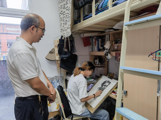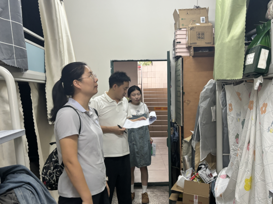 9月29日上午,十大买球的正规网站党委副书记王斌、学工办主任贺艳洁、专职辅导员杨书、胡培兵、沈瑶瑶、王誉燃分为两组,分别前往一舍、十四舍进行走访。走访过程中,王斌等人了解了同学们的国庆假期去向,强调出行安全、人身安全、财产安全、网络安全等,同时对宿舍进行了安全隐患排查,要求同学们离校前务必断水断电,做好宿舍卫生。