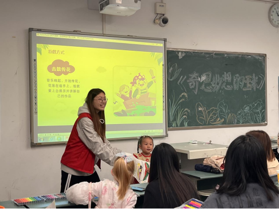 此次志愿服务活动的课程内容是《奇思妙想的玉米》。志愿者们鼓励孩子们从自己的视角出发,以《奇思妙想的玉米》为主题进行创作,用绘画的方式表达自己对世界的感知和理解。在该环节,儿童可以学习如何观察、如何记录玉米的变化,并培养他们对生活的热爱和对美的敏感度。第二个环节是以“击鼓传花”小游戏进行展评,引导收到“花”的小朋友上讲台展示自己的作品并表达自己的创作想法,旨在培养他们的创意思维、实践能力和表达能力。在活动过程中孩子们展现出极高的热情和投入度,他们乐于分享自己的作品和感受,不同的作品展现出丰富的想象力和创造力,作品往往充满童趣和创意。