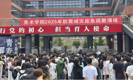 随着警报响起,演练正式启动。学院师生迅速反应,在教室、画室、实训室等场所就近采取“伏地、护头、抓牢”的避险动作。随后,学院党委副书记王斌、学工办主任贺艳洁,专职辅导员胡培兵、杨书、沈瑶瑶、王兆旺、王誉燃及志愿者引导学生疏散至艺术传媒大楼楼前广场。全员仅用5分钟完成撤离,展现了美院师生在突发事件中的应急处置能力。