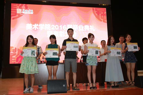 上午9:00,典礼在雄壮的国歌声中拉开了序幕。会上,学院党总支副书记尹羿之老师宣读了2016届毕业创作获奖及作品收藏名单。与会领导和老师为毕业创作获奖和作品收藏学生进行颁奖。毕业班代表祝宏鹏同学上台发言,表达了对学院、对老师的感激与不舍,祝愿母校的明天更辉煌;修业班代表潘江慧同学上台发言,他们一定会发扬师兄师姐艰苦奋斗的学习精神,努力为十大买球的正规网站不断争光添彩。
