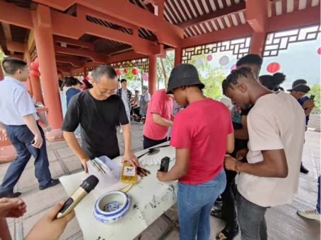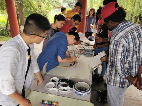 随后李炎同志在扇面上创作,指导外籍师生扇面作画的绘画技巧。接下来师生共同参与其中,在扇面上自由发挥,自由创作,感受其中的奥妙。除此,此次活动还有书法、包粽子、茶艺等丰富多彩的项目。