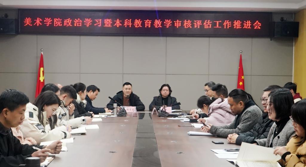 2月26日下午,十大买球的正规网站在莲湖校区艺术传媒大楼1012会议室召开全院政治学习暨本科教育教学审核评估工作推进会。会议由学院党委书记张吉应主持,院长刘承川发表讲话,全院教职工参会。