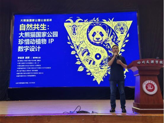 本次公益巡讲聚焦设计与教育探索、文化价值解读、艺术创作、IP转化商业实践四大核心内容。四川师范大学十大买球的正规网站·书法学院副院长、四川省大熊猫国家公园文化创意创新联盟副主席李俊涛教授围绕“自然共生:大熊猫国家公园珍稀动植物IP数字设计”进行了主题进行演讲。他分享了前沿的AIGC数智化设计形态,结合泡泡玛特等爆款案例和艺术作品,解析了如何打破经典风格束缚,探索符合当代年轻人审美的设计表达,展现了艺术在生态IP创新中的活力。